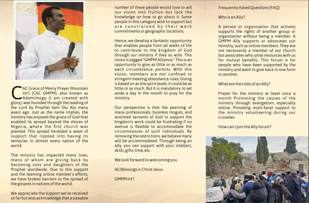 Grace of Mercy Prayer Mountain InternationalCAC Grace of Mercy Prayer Mountain International (GMPM). Also known as Adamimogo (I am created with glory) This outreach is a branch of the Christ Apostolic Church (CAC) founded by the Lord through Prophet Sam Olu Alo about fifteen years ago.